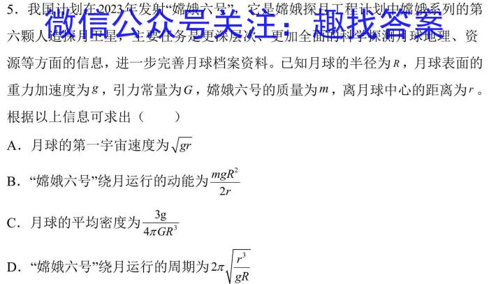 5.我国计划在2023年发射“嫦娥六号”,它是嫦娥探月工程计划中嫦娥系列的第六颗人造探月卫星,主要任务是更深层次、更加全面的科学探测月球地理、资源等方面的信息,进一步完善月球档案资料。已知月球的半径为R,月球表面的重力加速度为g,,引力常量为G,嫦娥六号的质量为m,离月球中心的距离为r。根据以上信息可求出()A.月球的第一宇宙速度为grB.“嫦娥六号绕月运行的动能为mgR^22rC.月球的平均密度为3g4GR^3D.“嫦娥六号”绕月运行的周期为22r^3gR