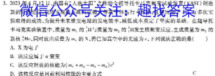 3.2023年4月12,中国有“人造太阳”之称的全超导托卡马克聚变试验装置(EASI)创造新的世界纪录,成功实现稳态高约束模式等离子体运行403秒,这是历经了十二万多次实验取得的成功,为提升未来聚变电站的发电效率,减低成本奠定了坚实的基础在超导托卡马克实验装置巾,质量为m1的1^2ll与质量为m2的1^3lI发生核聚变反应,生成质量为m3的新核2^4Hcc,,同时放出质量为的X,若已知真空中的光速为,下列说法正确的是()A.X为电子B.该反应属于a衰变C.该反应释放的核能为(m1+m2-m3-m4)c^2D.该核反应是前利用核能的主要方式