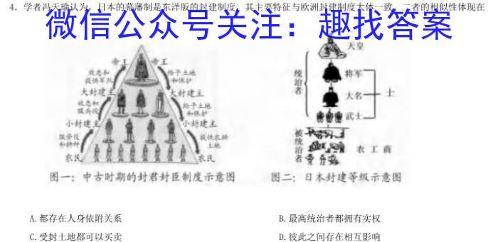 4.学者冯天瑜认为,日本的幕藩制是东洋版的封建制度,其主要特征与欧洲封建制度大体一致。二者的相似性体现在A.都存在人身依附关系B.最高统治者都拥有实权C.受封土地都可以买卖D.彼此之间存在相互影响