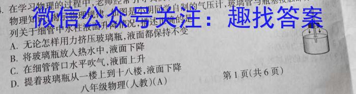 4.在学习物理的过程中,老师经常引导我们利用身边的物品做实验,在动手动脑的过程中学习物理知识,揭示物理规律。如图是小明同学自制的气压计,玻璃管与瓶塞接触部分不漏气。下列关于细管中水柱液面升降情况,描述正确的是A.无论怎样用力挤压玻璃瓶,液面都保持不变B.将玻璃瓶放入热水中,液面下降C.在细管管口水平吹气,液面上升D.提着玻璃瓶从一楼上到十八楼,液面下降八年级物理(人教)(A)第1页(共6页)