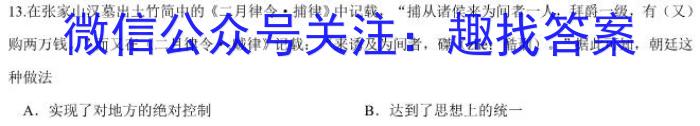 13.在张家山汉墓出土竹简中的《二月律令·捕律》中记载,“捕从诸侯来为间者一人,拜爵一级,有(又)购两万钱。”而又在《二月律令·.贼律》记载:“来诱及为间者,碟(zhe:酷刑)。”据此可知,朝廷这种做法A.实现了对地方的绝对控制B.达到了思想上的统一