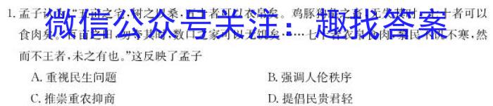 1.孟子认为:“五亩之宅,树之以桑,五十者可以衣帛矣。鸡豚狗彘之畜,无失其时,七十者可以食肉矣。百亩之田,勿夺其时,数口之家可以无饥矣……七十者衣帛食肉,黎民不饥不寒,然而不王者,未之有也。”这反映了孟子A.重视民生问题B.强调人伦秩序C.推崇重农抑商D.提倡民贵君轻
