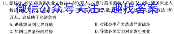 11.据统计,1933年美国失业人数达1280万人,占当时美国劳动人口的28.4%;德国失业人数达600万人,几乎占全国工人的一半;英国失业人数近300万人,法国失业人数达150万人。这反映了经济危机A.迅速波及到世界各地B.对社会生产力造成严重破坏C.加剧世界紧张的局势D.导致各国实力对比发生变化
