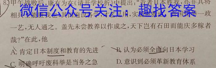 8.)甲午战败后,康有为在《请开学校折》中提出:“近者日本胜我,亦非其将相兵士能胜我也,其国遍设各学,才艺足用,实能胜我也。吾国任举一政一艺,无人通之。盖先未尝教养以作成之,天下岂有石田而能庆多稼者哉?”在此,他A.肯定日本制度和教育的先进B.认为必须全面向日本学习C.明确呼吁废科举是当务之急D.意识到必须革新教育体系