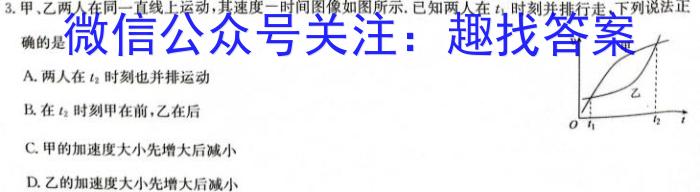 3.甲、乙两人在同一直线上运动,其速度一时间图像如图所示.已知两人在t1时刻并排行走,下列说法正确的是A.两人在l2时刻也并排运动B.在t2时刻甲在前,乙在后C.甲的加速度大小先增大后减小D.乙的加速度大小先增大后减小