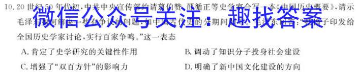 10.20世纪50年代初,中共约请翦伯赞、邵循正等史学家合写一本《中国历史概要》,请示如何解决一些有争议的问题,如中国古代史的分期问题等。回答:“把稿子印发给全国历史学家讨论,实行百家争鸣。”这一表态A.肯定了史学研究的关键性作用B.调动了知识分子投身社会建设C.增强了“双百方针”的影响力D.明确了新中国文化建设的方向