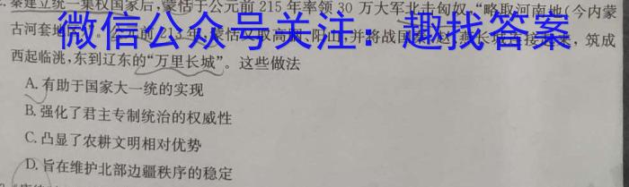 2.秦建立统一集权国家后,蒙恬于公元前215年率领30万大军北击匈奴,“略取河南地(今内蒙古河套地区)”。公元前213年,蒙恬又取高胭、阳山,并将战国秦、赵、燕长城连接起来,筑成西起临洮,东到辽东的“万里长城”。这些做法A.有助于国家大一统的实现B.强化了统治的权威性C.凸显了农耕文明相对优势D.旨在维护北部边疆秩序的稳定