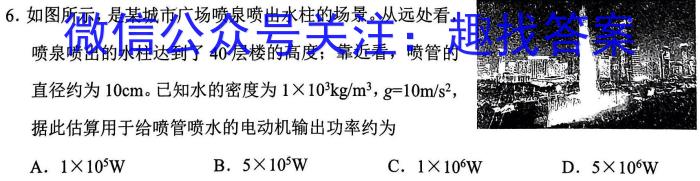 6.如图所示,是某城市广场喷泉喷出水柱的场景。从远处看,喷泉喷出的水柱达到了40层楼的高度;靠近看,喷管的直径约为10cm。已知水的密度为110^3kg/m^3,g=10m/s^2,据此估算用于给喷管喷水的电动机输出功率约为C.110^6W