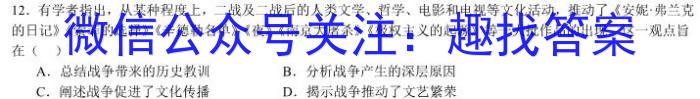 12.有学者指出,从某种程度上,二战及二战后的人类文学、哲学、电影和电视等文化活动,推动了《安妮·弗兰克的日记》《索菲的选择》《辛德勒名单》《夜》《》《极权主义的起源》等一大批作品的出现。这一观点旨在()A.总结战争带来的历史教训B.分析战争产生的深层原因C.阐述战争促进了文化传播D.揭示战争推动了文艺繁荣