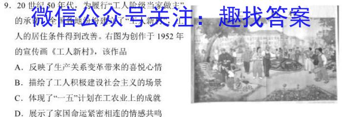 9.20世纪50年代,为履行“工人阶级当家做主”的承诺,全国各地纷纷建立了“工人新村”,工人的居住条件得到改善。右图为创作于1952年的宣传画《工人新村》,该作品A.反映了生产关系变革带来的喜悦心情B.描绘了工人积极建设社会主义的场景C.体现了“一五”计划在工农业上的成就D.展示了家国命运紧密相连的情感共鸣