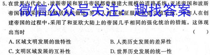 5.在世界古代史上,波斯帝国和罗马帝国都曾修建大规模的道路系统;亚述帝国和波斯帝国都曾采用过迁移居民的做法;罗马人曾在被征服地区建立殖民地。印加人在创建帝国的过程中,采用了和亚欧大陆上的帝国几乎相同的强化统治的措施。这体现出当时()A.区域文明发展的独特性B.人类历史发展的差异性C.文明区域发展的互补性D.世界历史发展的统一性