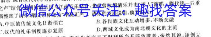 8.“清乐"源自汉代乐府的俗乐,魏晋时期逐渐雅乐化此后分散各地。河西地区的清乐与“羌胡之声”结合,南朝的清乐则与江南音乐结合,北朝曾改编清乐并由“胡人”演唱。隋代统一后重新整理了清乐,隋文帝称之为“华夏正声”。清乐的发展说明,魏晋以来()A.中原的传统文化日渐消亡B.各民族文化互动增多,不断交融C.汉代的礼乐制度逐步复原D.西域文化成为南北朝文化的主流