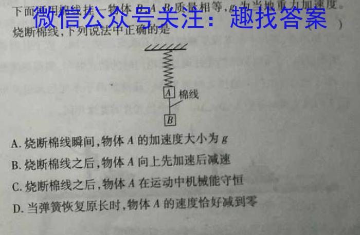 10.如图所示,将一只轻弹簧上端悬挂在天花板上,下端连接物体A.4下面再用棉线挂一物体B,A、B质量相等,g为当地重力加速度。烧断棉线,下列说法中正确的是()A.烧断棉线瞬间,物体A的加速度大小为gB.烧断棉线之后,物体A向上先加速后减速C.烧断棉线之后,物体A在运动中机械能守恒D.当弹簧恢复原长时,物体A的速度恰好减到零