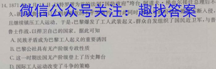 141871年2月17日,以特罗胥为首的法国“国防政府”垮台,阿道夫·梯也尔接任总理后不久,就与普鲁士签订了割地赔款的不平等条约。与此同时,梯也尔政府放任德军不断入侵,且继续镇压工人运动。于是,巴黎爆发了工人武装起义,群众自发组织了国民近卫军,与普鲁士作战,以捍卫自己的国家。据此可知A.成为巴黎工人起义的重要诱因B.巴黎公社具有性质C.这一时期法国无产阶级登上了历史舞台D.国际工人运动改变了斗争的策略