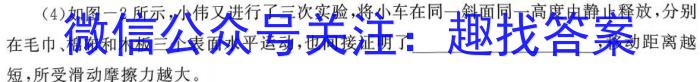 (4)如图一2所示,小伟又进行了三次实验,将小车在同一斜面同一高度由静止释放,分别在毛巾、棉布和木板三个表面水平运动,也间接证明了,移动距离越短,所受滑动摩擦力越大。