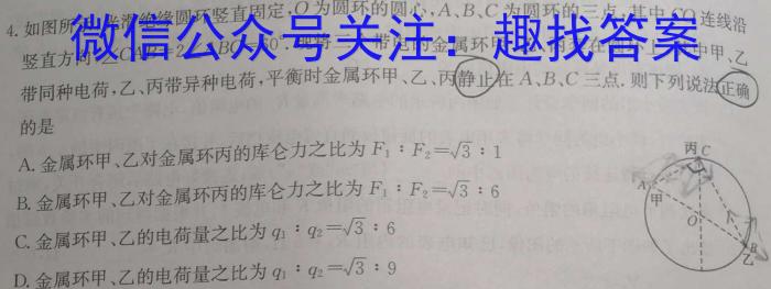 4.如图所示,光滑绝缘圆环竖直固定,O为圆环的圆心,A、B、C为圆环的三点,其中CO连线沿CO竖CAB=2ABC=60^.竖直方向,∠CAB=2∠ABC=60°.现将三个带电的金属环甲、乙、丙套在圆环上,其中甲、乙带同种电荷,乙、丙带异种电荷,平衡时金属环甲、乙、丙静止在A、B、C三点.则下列说法正确的是A.金属环甲、乙对金属环丙的库仑力之比为F:F2=3:1F1:F2=3:1B.金属环甲、乙对金属环丙的库仑力之比为F:F=3:6F1:F2=3:6C.金属环甲、乙的电荷量之比为q1:q2=3:6D.金属环甲、乙的电荷量之比为q1:q2=3:9