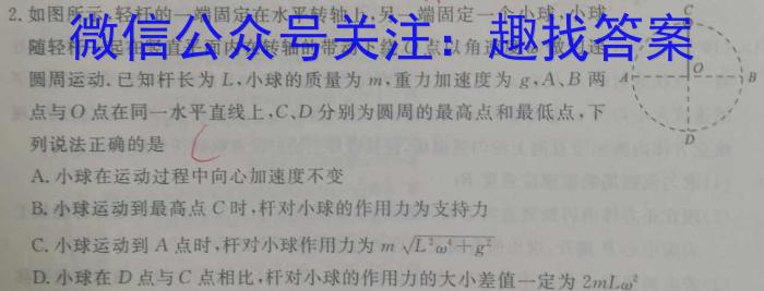 2.如图所示,轻杆的一端固定在水平转轴上,另一端固定一个小球,小球随轻杆一起在竖直平面内在转轴的带动下绕O点以角速度ω,做匀速圆周运动,已知杆长为L,小球的质量为m,重力加速度为g,A、B两点与O点在同一水平直线上,C、D分别为圆周的最高点和最低点,下列说法正确的是(A.小球在运动过程中向心加速度不变B.小球运动到最高点C时,杆对小球的作用力为支持力C.小球运动到A点时,杆对小球作用力为mL^2^4+g^2D.小球在D点与C点相比,杆对小球的作用力的大小差值一定为2mL^2
