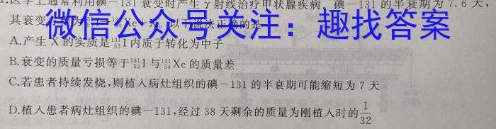 1.医学上通常利用碘一131衰变时产生γ射线治疗甲状腺疾病。碘一131的半衰期为7.6大,其衰变方程为53^131I54^131Xe+X。,以下说法正确的是A.产生X的实质是53^131I内质子转化为中子B.衰变的质量亏损等于53^131I与54^131Xe的质量差C.若患者持续发烧,则植入病灶组织的碘一131的半衰期可能缩短为7天D.植入患者病灶组织的碘一131,经过38天剩余的质量为刚植入时的-110