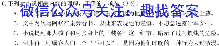6.下列对小说相关内容的理解,正确的一项是(3分)A.五个客人不断找机会跟人对话,主要是因为他们在陌生的住地缺少安全感。B.文中两次写阿张在桌旁看书,以此来表现他的谨慎,不愿意透露行军安排。C.小说提到那大孩子和阿张身上的“装备”这一细节,暗示了过封锁线的危险。D.阿张再三叮嘱客人们三个“不可以”,是因为他们昨晚的三种行为太过散漫。