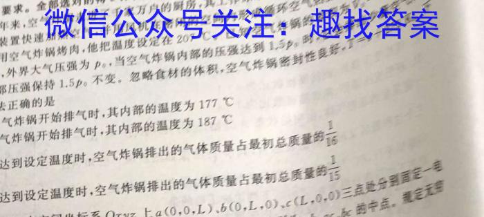 8.近几年来,空气炸锅走进了千家万户的厨房,其工作原理是“高速空环技烘烤装置快速加热空气,并用风机在密闭的空间内形成循环空气热流,速同学用空气炸锅烤肉,他把温度设定在207℃,已知空气炸锅的容积为=g207^C。27^C,p0,其内部压强保持1.5p。不变。忽略食材的体积,空气炸锅密封性良好,T=+2027℃,外界大气压强为p。当空气炸锅内部的压强达到1.5p,时,它会排出少置空1.5p。列说法正确的是A.空气炸锅开始排气时,其内部的温度为177^CC.当达到设定温度时,空气炸锅排出的气体质量占最初总质量的B.空气炸锅开始排气时,其内部的温度为187^C116D.当达到设定温度时,空气炸锅排出的气体质量占最初总质量的115电