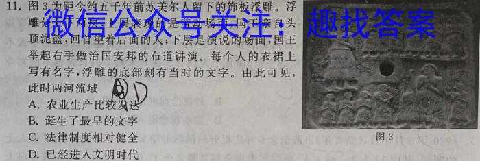 11.图3为距今约五千年前苏美尔人留下的饰板浮雕。浮雕分上下两层,上层表现的是劳动场面,国王亲自头顶泥篮,回首望着后面的人;下层是演说的场面,国王举起右手做治国安邦的布道讲演。每个人的衣裙上写有名字,浮雕的底部刻有当时的文字。由此可见,此时两河流域DA.农业生产比较发达B.诞生了最早的文字C.法律制度相对健全D.已经进人文明时代图3