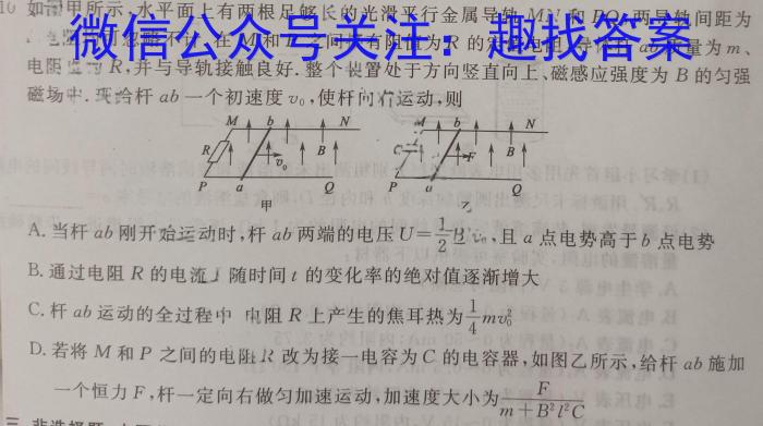 10如量甲所示,水平面上有两根足够长的光滑平行金属导轨MN和PQ,两导轨间距为、阻均可忽略不计.在M和P之间接有阻值为R的定值电阻,导体杆ab质量为m、电阻R,并与导轨接触良好.整个装置处于方向竖直向上、磁感应强度为B的匀强磁场中.现给杆ab一个初速度v0,使杆向右运动,则乙(A.当杆ab刚开始运动时,杆ab两端的电压U=12Bii,,且a点电势高于b点电势B.通过电阻R的电流随时间t的变化率的绝对值逐渐增大C.杆ab运动的全过程中电阻R上产生的焦耳热为14mv0^2D.若将M和P之间的电阻R改为接一电容为C的电容器,如图乙所示,给杆ab施加一个恒力F,杆一定向右做匀加速运动,加速度大小为Fm+B^2L^2C