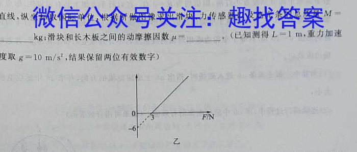 (2)根据数据作出(选填v^2-F")图像,得到如图乙所示的一条直线,纵坐标取国际单位,根据所做图像求出滑块、力传感器以及遮光条的总质量M=kg;滑块和长木板之间的动摩擦因数=。(已知测得L=1m,,重力加速度取g=10m/s^2,结果保留两位有效数字)