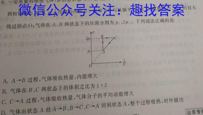 6.一定质量的理想气体,由初始状态A开始,经历A→B、B→C、C→A三个过程最后又回到初始状态A,其p-1V图像如图所示,已知AB与纵轴平行,BC与做轴平行,CA的延长点O,气体在A、B两状态下的压强分别为p1、2p1。下列说法正确的是A.A→B过程,气体吸收热量,内能增大B.气体在B、C两状态下的体积之比为1:2C.C→A过程,气体吸收热量,气体分子的平均动能增大D.气体由状态A经A→B、B→C、C→A回到状态A,整个过程吸热,对外做功