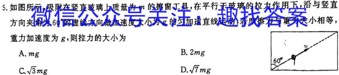 5.如图所示,吸附在竖直玻璃上质量为m的擦窗工具,在平行于玻璃的拉力作用下,沿与竖直方向夹角为60^的虚线方向做加速度大小为g的匀加速直线运动,若摩擦力与垂力大小相等,重力加速度为g,则拉力的大小为A.mgB.2mgC.3mgD.7mg