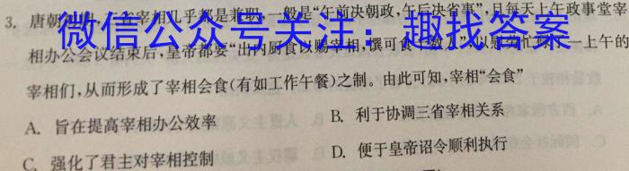 3.唐朝初期,三省宰相几乎都是兼职,一般是“午前决朝政,午后决省事”,且每天上午政事堂宰相办公会议结束后,皇帝都要“出内厨食以赐宰相,馔可食十数人”,以慰劳忙碌了一上午的宰相们,从而形成了宰相会食(有如工作午餐)之制。由此可知,宰相“会食”B.利于协调三省宰相关系A.旨在提高宰相办公效率D.便于皇帝诏令顺利执行C.强化了君主对宰相控制