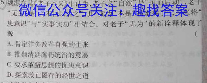 6.魏源在其《老子本义》中认为,老子之“自然”是”迫而后动”,老子“无为”是“乃不治以治之”,其“无为”不是“枯坐拱手”,主张将患意识”与“实事实功”相结合。对老子“无为”的新诠释体现了源(A.肯定洋务改革自强的主张B.推翻清廷腐朽统治的意愿C.要求革新思想的忧患意识D.探索救亡图存的经世之道