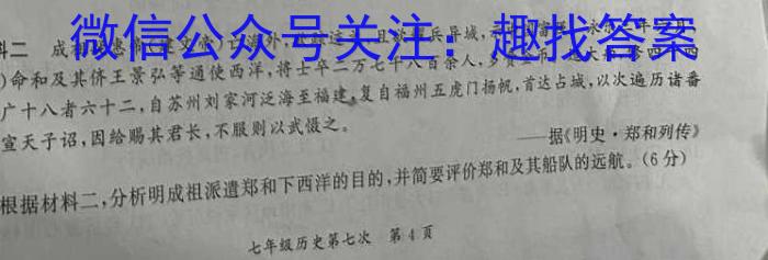 材料二成祖疑惠帝(建文帝)亡海外,欲踪迹之,且欲耀兵异城,示中国富强,永乐三年六月,(上)命和及其侪王景弘等通使西洋,将士卒二万七千八百余人,多贵金币,造大舶,修四十四丈、广十八者六十二,自苏州刘家河泛海至福建,复自福州五虎门扬帆,首达占城,以次遍历诸番国,宣天子诏,因给赐其君长,不服则以武慑之。据(明史·郑和列传》(3)根据材料二,分析明成祖派遭郑和下西洋的目的,并简要评价郑和及其船队的远航。(6分)第4页