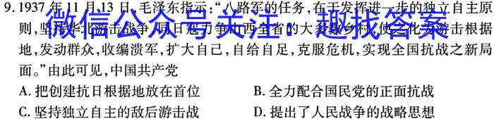 9.1937年11月13日,指示:“八路军的任务,在于发挥进一步的独立自主原则,坚持华北游击战争,同日寇力争山西全省的大多数乡村,使之化为游击根据地,发动群众,收编溃军,扩大自己,自给自足,克服危机,实现全国抗战之新局面。”由此可见,A.把创建抗日根据地放在首位B.全力配合国民党的正面抗战C.坚持独立自主的敌后游击战D.提出了人民战争的战略思想