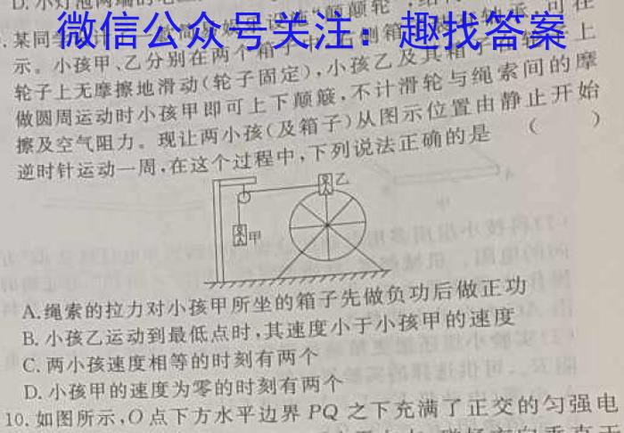 示,小孩甲、乙分别在两个箱子中,右侧箱子装有轴承,可在轮子上无摩擦地滑动(轮子固定),小孩乙及其箱子在轮子上做圆周运动时小孩甲即可上下顺筋,不计滑轮与绳索间的摩擦及空气阻力,现让两小孩(及箱子)从图示位置由静止开始()逆时针运动一周,在这个过程中,下列说法正确的是AA.绳索的拉力对小孩甲所坐的箱子先做负功后做正功B.小孩乙运动到最低点时,其速度小于小孩甲的速度C.两小孩速度相等的时刻有两个.小孩甲的速度为零的时刻有两个