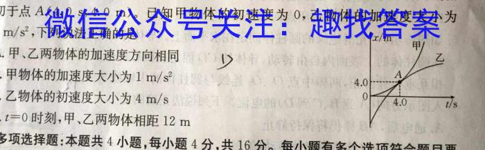 8.甲、乙两物体在同一条直线上做匀变速运动的切于点A(4.0s,4.0m)。,已知甲物体的初速度为0,乙物体的加速度大小为1m/s^2,下列说法正确的是A.甲、乙两物体的加速度方向相同B.甲物体的加速度大小为1m/s^2C.乙物体的初速度大小为4m/sD.t=0时刻,甲、乙两物体相距12m1