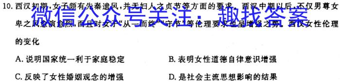 10.西汉初期,女子颇有先秦遗风,并无妇人之贞节等方面的要求。西汉中期以后,不仅男尊女卑之风愈演愈烈,而且对女子“从一而终”“守节”等伦理要求也呈增强之势。西汉女性伦理的变化A.说明国家统一利于家庭稳定B.表明女性道德自律意识增强C.反映了女性婚姻观念的增强D.是社会主流思想影响的结果