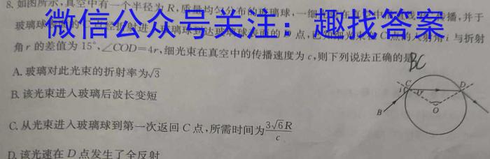 8.如图所示,真空中有一个半径为R,质量均匀分布的玻璃球,一细光束在真空中沿直线BC传播,并于玻璃球表面的C点经折射进入玻璃球到达玻璃球表面的D点,已知细光束在C点的入射角;与折射角的差值为15^,COD=4r,,细光束在真空中的传播速度为c,则下列说法正确的是A.玻璃对此光束的折射率为3B.该光束进入玻璃后波长变短C.从光束进入玻璃球到第一次返回C点,所需时间为36cD.该光速在D点发生了全反射DB
