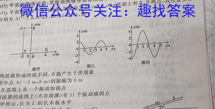 10.如图甲所示,在xOy平面内有两个波源S1(-2m,0)和S2(4m,0),,两波源做垂直于CDxOy平面的简谐运动,其振动图像分别如图乙和图丙所示,两波源形成的机械波在xOy平面内向各个方向传播,波速均为25cm/s.xOy平面上有A、B两点,其位置坐标分别为A(-2m,8m),B(0.5m,0),则O5/mA.两波源形成的波不同,不能产生干涉现象B.图中点A(-2m,8m)的振幅为6mC.AB连线上有一个振动加强点D.两波源的连线上(不含波源)有11个振动减弱点