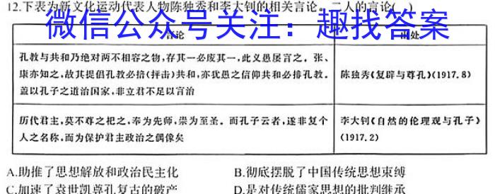 12.下表为代表人物陈独秀和的相关言论。二人的言论()A.助推了思想解放和政治民主化B.彻底摆脱了中国传统思想束缚C.加速了袁世凯尊孔复古的破产D.是对传统儒家思想的批判继承