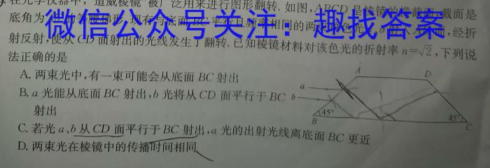 A在光学仪器中,“道威棱镜”被广泛用来进行图形翻转.如图,ABCD是棱镜的横截面,截面是底角为45^的等腰梯形.现有与底面BC平行且频率相同的两束单色光a、b射入AB面,经折射反射,使从CD面射出的光线发生了翻转,已知棱镜材料对该色光的折射率n=2,下列说法正确的是A.两束光中,有一束可能会从底面BC射出B.a光能从底面BC射出,b光将从CD面平行于BCb射出C.若光a、b从CD面平行于BC射出,a光的出射光线离底面BC更近D.两束光在棱镜中的传播时间相同