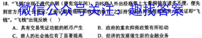 18.“飞钱”出现于唐代中期(唐宪宗年间),当时商人外出经商带上大量铜钱有诸多不便,便先到官方开具一张凭证,上面记载着地方和钱币的数目,之后持凭证去异地提款购货,此凭证即“飞钱”。“飞钱”出现反映()A.具有交易凭证功能的纸币产生B.政府的重农抑商政策有所松动C.商人的社会地位有了显著提高D.经济的发展催生新的金融业务