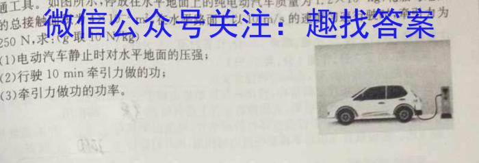 21.以纯电动汽车为代表的新能源汽车具有节能、环保的特点,是国家大力推广的新型交能、通工具。如图所示,停放在水平地面上的纯电动汽车质量为1.2×10kg,轮胎与地面1.210^3kg,410^-2m^2,的总接触面积为4×10-²m,在水平路面上以10m/s的速度匀速行驶时,牵引力为10m/s250N,求:(g取10N/kg)10N/kg)(1)电动汽车静止时对水平地面的压强;(2)行驶10min牵引力做的功;(3)牵引力做功的功率。