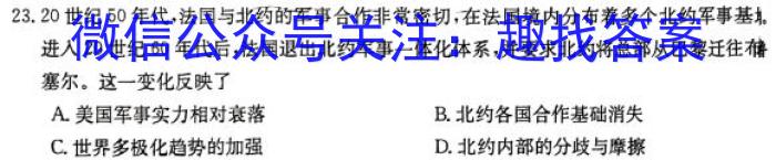 23.20世纪50年代,法国与北约的军事合作非常密切,在法国境内分布着多个北约军事基地。进入20世纪60年代后,法国退出北约军事一体化体系,并要求北约将总部从巴黎迁往布塞尔。这一变化反映了A.美国军事实力相对衰落B.北约各国合作基础消失C.世界多极化趋势的加强D.北约内部的分歧与摩擦