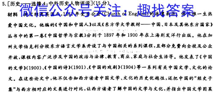 5.[历史——选修中外历史人物评说](15分)材料傅兰雅是英国人,1861年受圣公会(ChurchofEngland)的派遣来华。傅兰雅一生热爱中国文化。他编的《中国和中国人》以及《东方学大学教材——中国、日本及其他东方国家》丛书中的第一卷《中国哲学与宗教》分别于1897年和1900年在上海别发洋行出版。他在加州大学伯克利分校东方语言文学系开设了与中国相关的系列课程,且部分免费向全校及公众开放,课程内容广泛涉及中国的政治与法律、教育、商业、家庭与社会生活等。他发表了《中国的文学》(1900)、《中国的诗》(1901)、《中国的戏剧》(1904)等一系列有关中国文学、文化的论文。在这些论文中,他不仅告知西方读者中国文学、文化的历史优越性,还把中国的“经史子集”与西方相对应的文类进行对比,让西方读者了解中国的文学与文化,并指出中国文学因某(2)根据材料并结合所学知识,评析傅兰雅传播中国文化的影响。(9分)