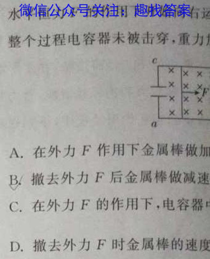 7.足够长的平行金属导轨ab、ed水平放置于竖直向下的匀强磁场中,磁感应强度大小为B,ac之间连接有电容为C的电容器,导轨间距为L,长度为L的光滑金属棒垂直导轨放置,与导轨接触良好,俯视图如图所示。金属棒在水平恒力F的作用下开始向右运整个过程电容器未被击穿,重力A.在外力F作用下金属棒做加B.撤去外力F后金属棒做减速C.在外力F的作用下,电容器D.撤去外力F时金属棒的速度