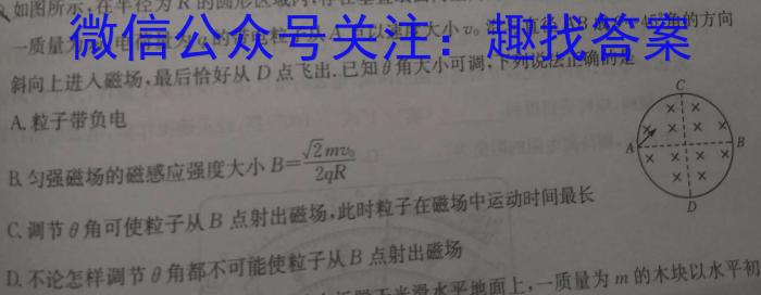 如图所示,在半径为R的圆形区域内,存在垂直纸面向里的匀强磁场,直径AB与CD垂直.一质量为m、电荷量为的带电粒子从A点以速度大小v0沿与直径AB成=45^角的方向斜向上进人磁场,最后恰好从D点飞出.已知θ角大小可调,下列说法正确的是A.粒子带负电B.匀强磁场的磁感应强度大小B=2mvb2qRC.C.调节θ角可使粒子从B点射出磁场,此时粒子在磁场中运动时间最长D.不论怎样调节角都不可能使粒子从B点射出磁场θ