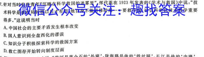 7.针对当时有些青年“沉睡在科学救国的迷雾里”,挥代英在1923年发表的《学术与救国》中说:“技术科学是在时局转移以后才有用,他自身不能转移时局……要救中国,社会科学比技术科学重要得多。”这说明当时A.中国社会的主要矛盾发生根本改变B.国人意识到全盘西化的谬误C.知识分子积极探索科学的救国方案D.救亡图存开始转向制度层面