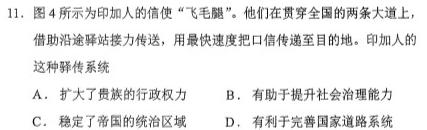 11.图4所示为印加人的信使“飞毛腿”。他们在贯穿全国的两条大道上,借助沿途驿站接力传送,用最快速度把口信传递至目的地。印加人的这种驿传系统A.扩大了贵族的行政权力B.有助于提升社会治理能力C.稳定了帝国的统治区域D.有利于完善国家道路系统