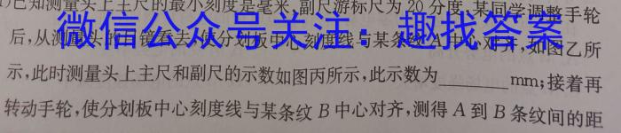 (1)已知测量头上主尺的最小刻度是毫米,副尺游标尺为20分度,某同学调整手轮后,从测量头的目镜看去,使分划板中心刻度线与某条纹A中心对齐,如图乙所示,此时测量头上主尺和副尺的示数如图丙所示,此示数为mm;接着再转动手轮,使分划板中心刻度线与某条纹B中心对齐,测得A到B条纹间的距【23·(新高考)CCJ·物理(二)CCJ.