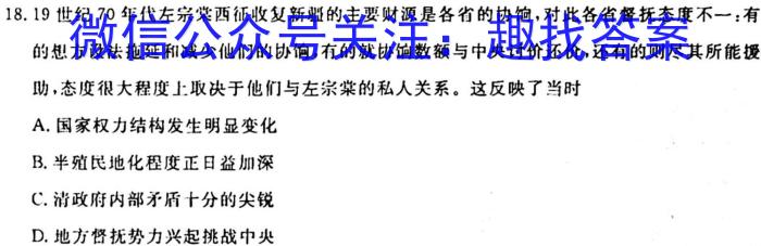 18.19世纪70年代左宗棠西征收复新疆的主要财源是各省的协饷,对此各省督抚态度不一:有的想方设法拖延和减少他们的协响,有的就协饷数额与中央讨价还价,还有的则尽其所能援助,态度很大程度上取决于他们与左宗棠的私人关系。这反映了当时A.国家权力结构发生明显变化B.半殖民地化程度正日益加深C.清政府内部矛盾十分的尖锐D.地方督抚势力兴起挑战中央